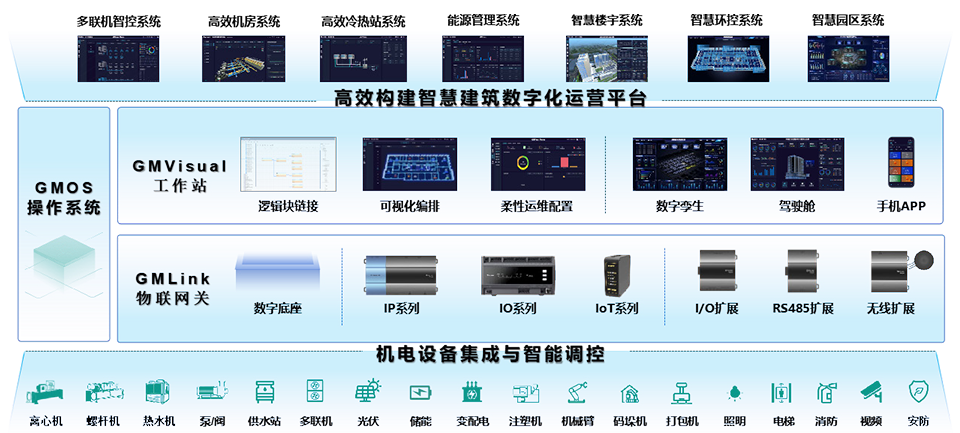 建筑機電領域專屬的開放式 GMOS 操作系統,并以之為核心推出樓宇智控系統,包含物聯網關、工作站、行業解決方案,徹底解決設備聯接調試周期長、工程需每單 定制的行業難題,實現對建筑內機電設備的集中監控和智慧管理。